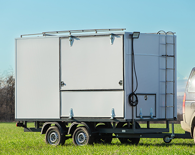 Металло-каркас из профильной трубы, обшитый композитным материалом (цвет согласовывается с заказчиком). Перегородки и полки выполнены из влагостойкой фанеры березы. С наружной части прицепа установлена лестница на крышу. Крыша покрыта резиновым материалом 3 мм (рисунок шашечки, либо пяточки), обеспечивающим гарантированное противоскользящее покрытие. Двери прицепа выполнены из металло-каркаса: 3 откидные вверх на газовых упорах, и 3 откидные в низ для дополнительного полочного пространства, либо открытие на 180 градусов для обеспечения полного подхода к полочному пространству.