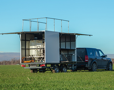 Внутреннее расположение прицепа: Три отсека один для транспортировки агродронов, второй для генераторов и обслуживающих компонентов. Третий отсек с растворным узлом в который входит одна емкость 500 литров, вторая на 200 литров в которых установлены мешалки на мотор редукторах (0,55 кВт), валы выполнены из нержавеющей стали (asi 304). Дополнительно установлена емкость на 100 литров для чистой воды, позволяющая промыть систему по завершению работ. Все емкости соединены в одну общую систему из полипропиленовых труб, методом горячей пайки к химическому насосу (0,65 кВт), который позволяет путем манипуляции и дросселированию кранов перегонять, выдавать или забирать растворы аграрной деятельности. В прицепе выполнена электро-подготовка с освещением из 6 фонарей расположенных на откидных дверях и в каждом отсеке. Дополнительно установлены розетки в полке для генераторов по 2 разъема в каждой на 220 Вт, и щит управление растворным узлом на магнитных пускателях (расположение обговаривается с заказчиком) Емкость для добавления препаратов.