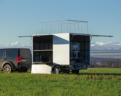 Внутреннее расположение прицепа: Три отсека один для транспортировки агродронов, второй для генераторов и обслуживающих компонентов. Третий отсек с растворным узлом в который входит одна емкость 500 литров, вторая на 200 литров в которых установлены мешалки на мотор редукторах (0,55 кВт), валы выполнены из нержавеющей стали (asi 304). Дополнительно установлена емкость на 100 литров для чистой воды, позволяющая промыть систему по завершению работ. Все емкости соединены в одну общую систему из полипропиленовых труб, методом горячей пайки к химическому насосу (0,65 кВт), который позволяет путем манипуляции и дросселированию кранов перегонять, выдавать или забирать растворы аграрной деятельности. В прицепе выполнена электро-подготовка с освещением из 6 фонарей расположенных на откидных дверях и в каждом отсеке. Дополнительно установлены розетки в полке для генераторов по 2 разъема в каждой на 220 Вт, и щит управление растворным узлом на магнитных пускателях (расположение обговаривается с заказчиком)