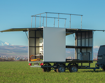 Внутреннее расположение прицепа: Три отсека один для транспортировки агродронов, второй для генераторов и обслуживающих компонентов. Третий отсек с растворным узлом в который входит одна емкость 500 литров, вторая на 200 литров в которых установлены мешалки на мотор редукторах (0,55 кВт), валы выполнены из нержавеющей стали (AISI 304). Дополнительно установлена емкость на 50 литров для чистой воды, позволяющая промыть систему по завершению работ. Все емкости соединены в одну общую систему из полипропиленовых труб, методом горячей пайки к химическому насосу (0,65 кВт), который позволяет путем манипуляции и дросселированию кранов перегонять, выдавать или забирать растворы аграрной деятельности. В прицепе выполнена электро-подготовка с освещением из 6 фонарей расположенных на откидных дверях и в каждом отсеке. Дополнительно установлены розетки в полке для генераторов по 2 разъема в каждой на 220 Вт, и щит управление растворным узлом на магнитных пускателях (расположение обговаривается с заказчиком) Емкость для добавления препаратов.